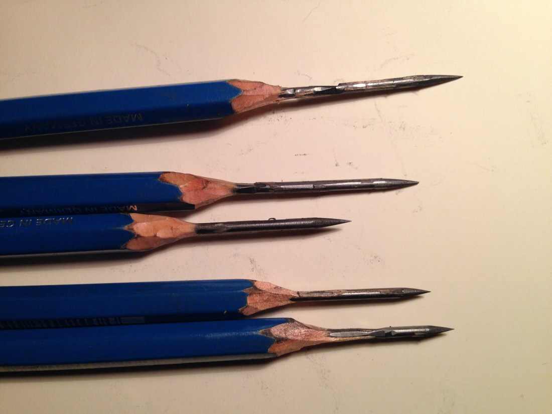 Earlier this evening while I was sitting on the couch sharpening pencils for tomorrow, Billy my mother-in-law’s boyfriend read me some facts about pencils. And it’s a good thing too. Otherwise I wouldn’t know that John Steinbeck went through 300 pencils writing East of Eden. He used about 60 a day. Tonight I sharpened five and it was a doozy. My sharpened five are pictured above and they are pretty shameful. I learned this today: you use an exacto knife to expose about 2 inches of lead. Then you sharpen the length of lead to a fine needle point on a square of sandpaper. The cutting was fine, the sharpening got the better of me. I’ll go back and correct tomorrow with a lower grit sand paper. The pencils have points and all, but the shaft of lead remains pretty straight. I was supposed to make a very long refined cone out of the lead.