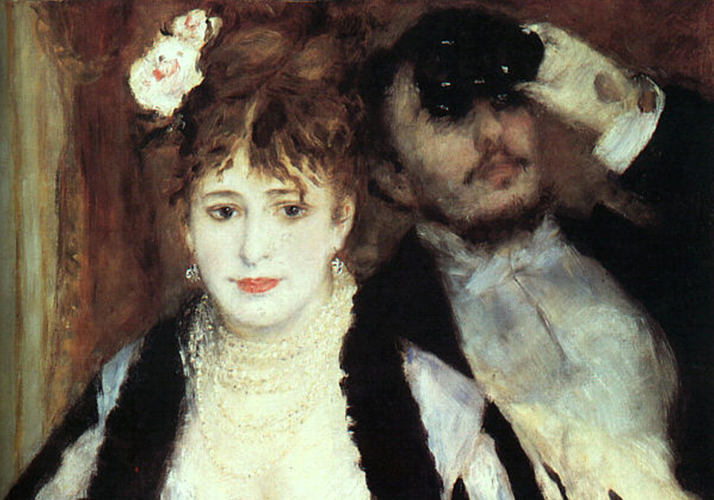 (Featured image and larger below because it’s so beautiful I wanted to show the whole thing: Renoir’s La Loge, 1874)